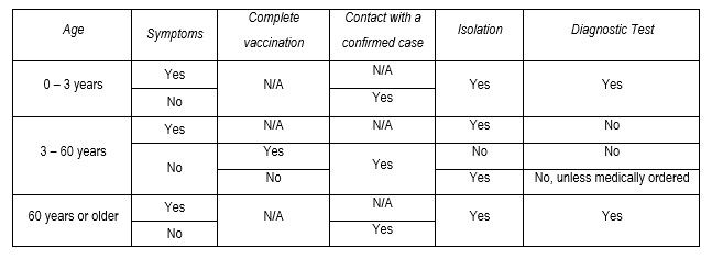 Similarly, people who are asymptomatic but who have had close contact with a confirmed case of COVID-19 and who have not completed their vaccination, should also isolate for a period of seven (7) days from the first day of exposure. In the event that the person cannot perform telework or remote work, they can go to a health care professional who can order the diagnostic test to clarify their situation and avoid the spread of the virus among their co-workers. However, in cases were individuals have completed their vaccination, they need not comply with the isolation order nor have the diagnostic test performed, they must only refrain from participating in events that involve crowds and must avoid close contact with people over 60 years, children under three (3) years or with people who have any risk factor for a period of seven (7) days from the day of exposition.